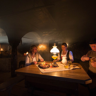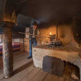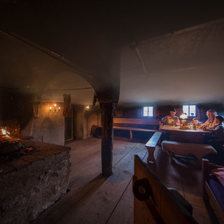 Wenn man eintritt, nimmt man zuerst den Geruch nach Rauch war, der durch den Raum strömt. Der Boden ist aus Holz, und wenn sich die Augen langsam an die Dunkelheit und den Rauch gewöhnen, treten wir in eine bescheidene Stube ein, die das wichtigste Zimmer im Haus war. Die warme Feuerstelle, Geschirr aus Eisen und Ton, Kaffeehäferl auf dem Regal am Rand der Feuerstelle, Schalen, Töpfe mit verschiedenen Utensilien sind Charakteristiken dieser Art von Küche. Die Wände und die Decke glänzen vom Ruß, der sich jahrhundertelang dort angelagert hat. Rauchstuben hatten die Funktion frühzeitlicher ,,Wohnküchen“: In ihnen fand bis herauf um 1960 das ganze bäuerliche Familienleben statt - bei offenem Feuer unter einem wabernden Rauchhimmel. Die Rauchstube ist komplett eingerichtet und wird noch zum Kochen, Brotbacken und Selchen beheizt. Dann hängen unter der pechschwarzen Tramdecke gebeizte Fleischstücke im Rauch.