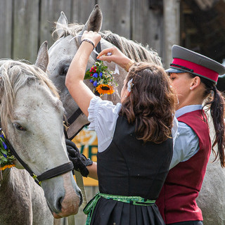 Gegen 12 Uhr kamen die Junghengste beim Gasthof Wiendl (ca. 2 km oberhalb von Maria Lankowitz) an, wo sie bereits von zahlreichen Gästen erwartet wurden. Auf der Wiese beim Gasthof wurden die Pferde von einheimischen Mädchen im feschen Dirndl mit bunten Blumensträußen geschmückt. Allein schon diese Szene ist eine Augenweide, die man einmal gesehen haben muss!